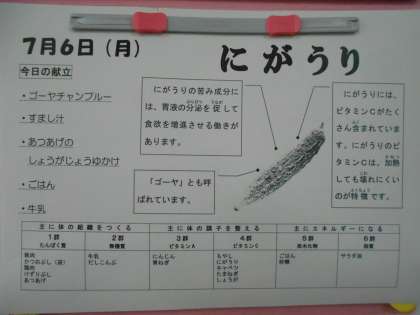 本日の「ゴーヤチャンプルー」で使われた「ゴーヤ(にがうり)」には、ビタミンCがたくさん含まれていて、にがうりの成分は食欲を増進させる働きがあります。