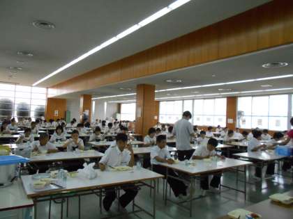 (写真は、昼食ホールでの1年生の給食の様子です。)