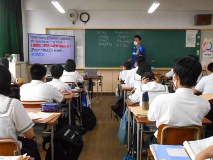 本日、2年1組で英語科金山先生の研究授業を行いました。日常の英会話練習や構文「動詞+人+もの」の学習を行いました。電子黒板による説明、問題練習を繰り返して行いました。