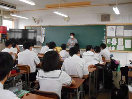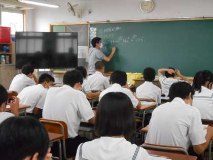 本日、3年3組で理科玉越先生の研究授業を行いました。単元名は「酸・アルカリと塩」、酸性とアルカリ性や、化学式に関わる学習を行いました。