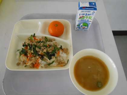 本日の献立は、豚ミンチとニラのそぼろ丼、オクラのみそ汁、冷凍ミカン、牛乳です。