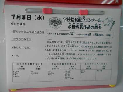 本日の献立は「学校給食献立コンクール」の最優秀作品で、「疲労回復と夏バテ防止」のために工夫がなされたメニューとなっています。