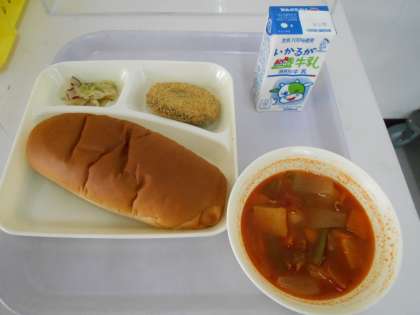 本日の献立は、黒糖パン、チキンレバーカツ、ケチャップ煮、タコとキャベツのバジルソテー、牛乳です。