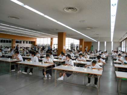 (写真は、昼食ホールでの1年生の給食の様子です。)
