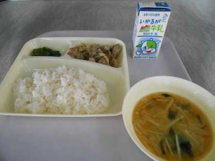 本日の献立は、ごはん、豚肉のしょうが焼き、みそ汁、さんど豆のごまあえ、牛乳です。