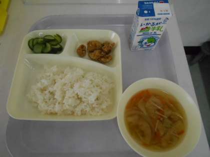 本日の献立は、ごはん、豚肉の香味揚げ、すまし汁、あっさりキュウリ、牛乳です。