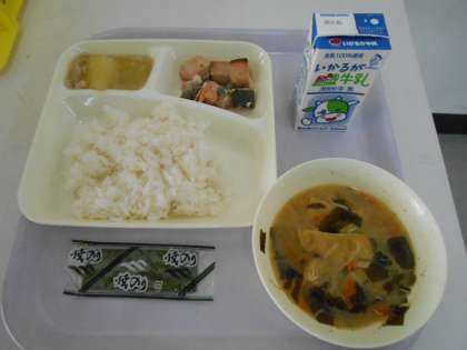 本日の献立は、ごはん、焼きのり、鮭のつけ焼き、冬瓜(とうがん)の煮物、みそ汁、牛乳です。