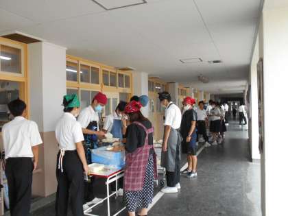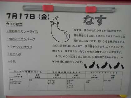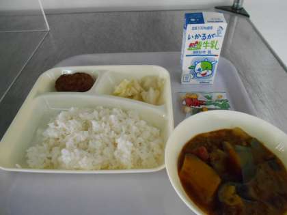本日の献立は、夏野菜のカレーライス、焼きミニハンバーグ、キャベツのサラダ、豆コンブ、牛乳です。
