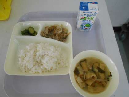 本日の献立は、ごはん、豚肉のごまだれ焼き、五目汁、キュウリのおかか和え、牛乳です。