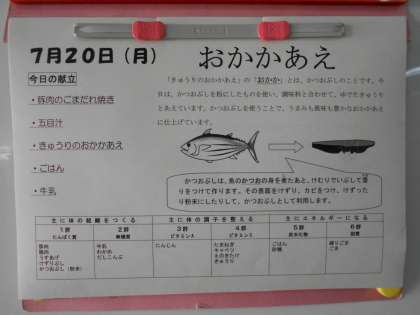本日の「キュウリのおかか和え」の「おかか」は、鰹節のことで、「キュウリのおかか和え」は鰹節の粉を調味料と合わせて、ゆでたキュウリとあえてつくっています。