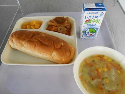 本日の献立は、おさつパン、煮込みハンバーグ、コーンスープ、黄桃、牛乳です。