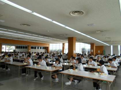 (写真は、昼食ホールでの1年生の給食の様子です。)