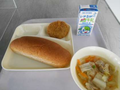 本日の献立は、ライ麦パン、チキンレバーカツ、スープ、牛乳です。