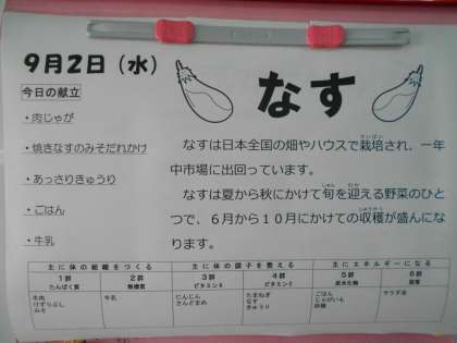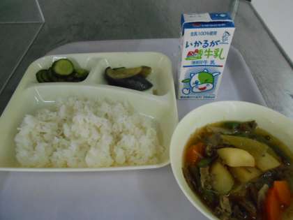 本日の献立は、ごはん、肉じゃが、焼きナスのみそだれかけ、あっさりきゅうり、牛乳です。