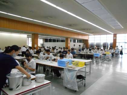 (写真は、2年生の昼食ホールでの給食準備の様子です。)