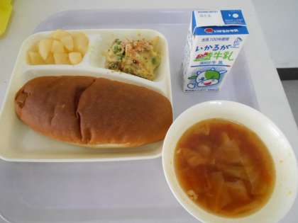 本日の献立は、黒糖パン、豆乳マカロニグラタン、トマトスープ、洋ナシ、牛乳です。