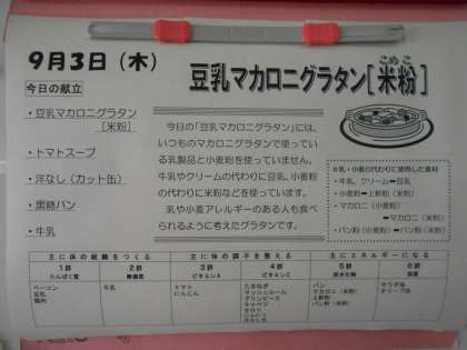 本日の献立の「豆乳マカロニグラタン」では、牛乳やクリームの代わりに豆乳が、そして、小麦粉の代わりには米粉が使われています。