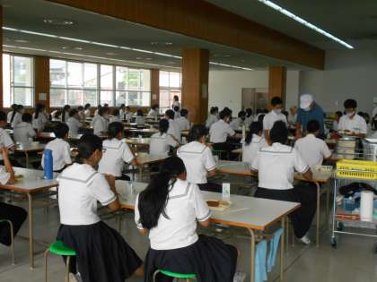(写真は、1年生の昼食ホールでの給食準備の様子です。)
