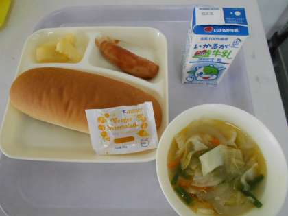 本日の献立は、コッペパン、マーマレード、フランクフルトのケチャップソース、焼きじゃが、スープ、牛乳です。