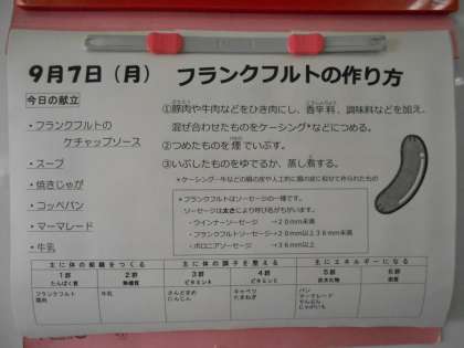 本日の献立の「フランクフルト」はソーセージの一種で、ソーセージの太さによって、ウインナーソーセージ、フランクフルトソーセージ、ボロニアソーセージと、呼び名が違います。
