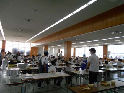 (写真は、昼食ホールでの1年生の給食準備の様子です。)