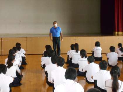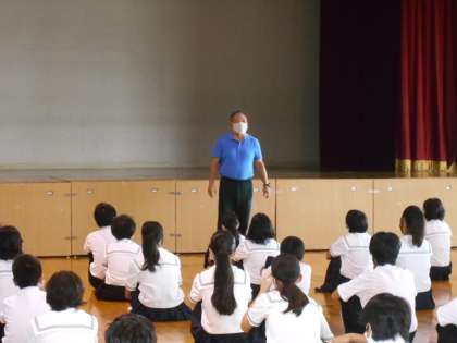 1年生の学年集会を講堂で行いました。木村先生から、「学校生活で事故や怪我がないよう過ごすために気をつけてほしいこと」についてのお話がありました。