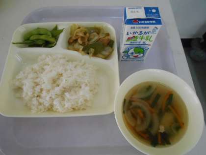 本日の献立は、ごはん、回鍋肉(ホイコウロー)、中華スープ、えだまめ、牛乳です。
