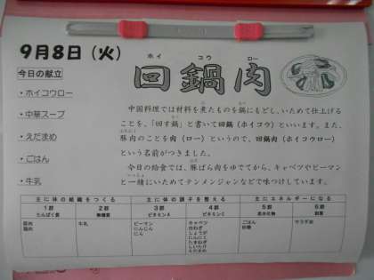 本日の献立は中華メニュー、その中の「回鍋肉(ホイコウロー)」は、豚ばら肉をゆでて、キャベツやピーマンと一緒に炒めてから、テンメンジャンなどで味つけされています。