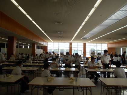 (写真は、昼食ホールでの2年生の給食準備の様子です。)