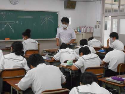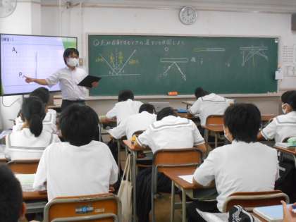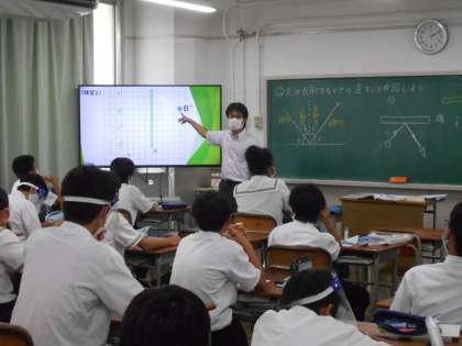 本日の5限目に、1年3組で教育実習生増田先生の理科の研究授業を行いました。光が反射するときの規則性について作図作業を行って学習をしました。