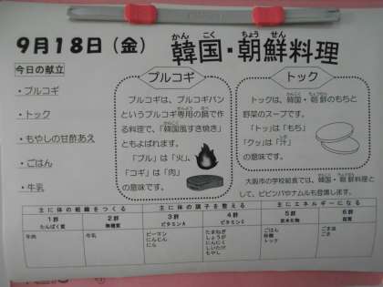 本日の献立は、「韓国・朝鮮料理」の中から、プルコギとトックでした。給食では、ビビンバやナムルなども登場します。