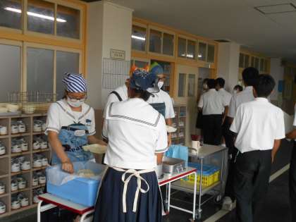 (写真は、3年生廊下での3年生の給食準備の様子です。)