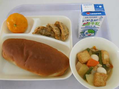 本日の献立は、黒糖パン、あげぎょうざ、中華煮、冷凍みかん、牛乳です。