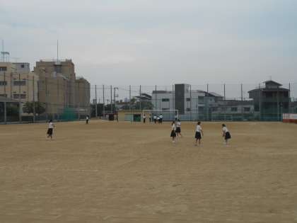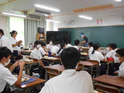3年生の教室での給食の様子と、昼休みの運動場の様子です。