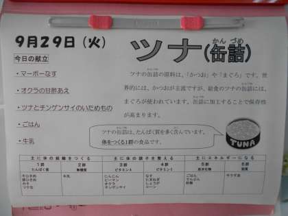 本日の献立は、ごはん、マーボーなす、ツナとチンゲン菜の炒め物、オクラの甘酢あえ、牛乳です。「ツナ」の缶詰の原材料は、「かつお」や「まぐろ」で、たんぱく質をたくさん含んています。