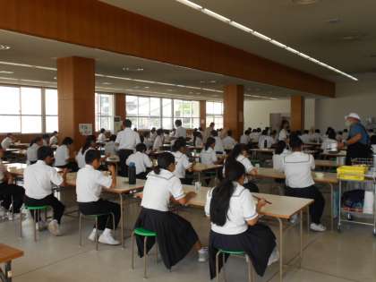 (写真は、昼食ホールでの1年生の給食の様子です。)