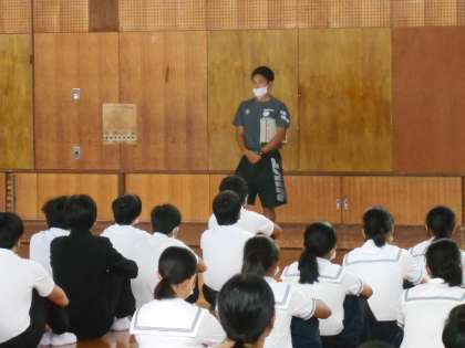 3年生の学年集会を体育館で行いました。安田先生から、「自分自身が今するべきことを判断する力をしっかりと持ってほしい」というお話がありました。