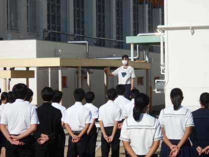 3年生の学年集会を下グラウンドで行いました。修学旅行に向けて、平和セレモニーで歌う曲『青い空は』を、3年2組諏訪夏木さんの指揮で練習しました。