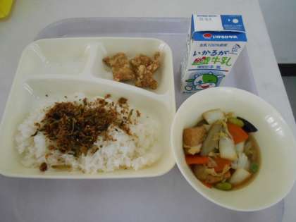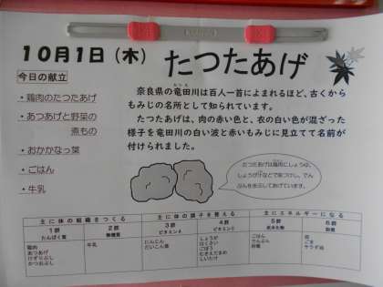 本日の献立は、ごはん、おかか菜っ葉、鶏肉の竜田揚げ、厚揚げと野菜の煮物、牛乳です。本日の献立の「竜田揚げ」は、肉の赤い色と衣の白い色が混ざった様子が、古くからもみじの名所として有名な奈良県の竜田川の白い波と赤いもみじに似ていることから名付けられたそうです。