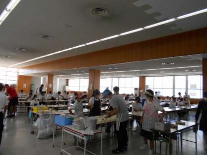(写真は、昼食ホールでの1年生の給食準備の様子です。)