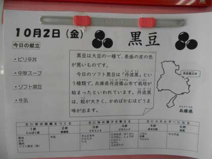 本日の献立は、ピリ辛丼、中華スープ、ソフト黒豆、牛乳です。本日の献立は、丼ぶりメニューでした。「ソフト黒豆」は、兵庫県丹波篠山で栽培されている「丹波黒」が使われています。