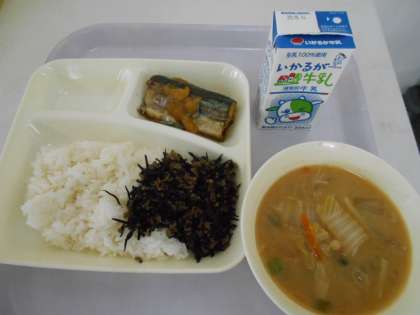 本日の献立は、ごはん、秋刀魚のみぞれかけ、牛ヒジキそぼろ、みそ汁、牛乳です。本日の献立に登場した秋の味覚でもある「秋刀魚(さんま)」は、たんぱく質やビタミンB2が豊富に含まれている食材です。