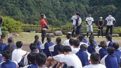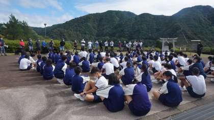 交流センターを出発し、ダム湖の近くの広場で、実行委員の田井さんによる司会で、日野くんが挨拶しました。