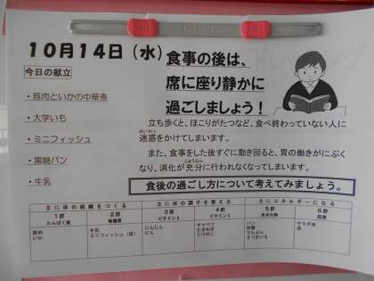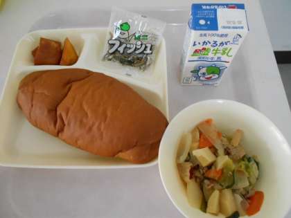 本日の献立は、黒糖パン、豚肉とイカの中華煮、大学いも、ミニフィッシュ、牛乳です。