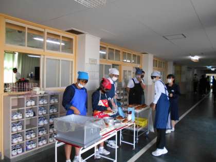 (写真は、3年生廊下での3年生の給食準備の様子です。)