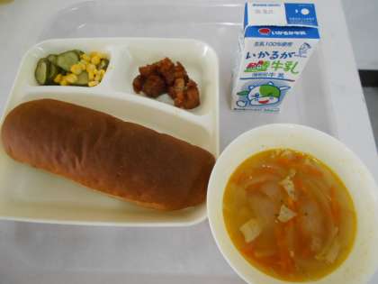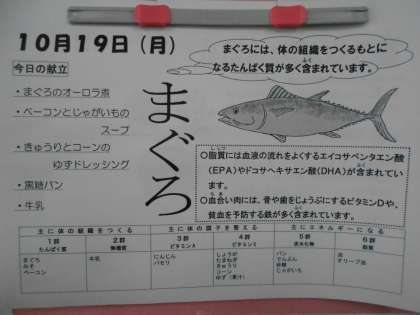 本日の献立は、黒糖パン、マグロのオーロラ煮、ベーコンとジャガイモのスープ、キュウリとコーンのゆずドレッシング、牛乳です。本日の献立の「マグロのオーロラ煮」で使われたマグロには、体の組織をつくるもととなるたんぱく質が豊富に含まれています。