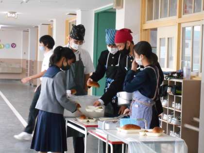 (写真は、3年生廊下での3年生の給食準備の様子です。)