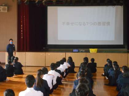 2年生の学年集会を講堂で行いました。吉江先生から、「7つの習慣」をもとにした「不幸せになる7つの悪習慣」と題して、学校生活で生徒の皆さんに日頃から気をつけてほしい事がらについてのお話がありました。