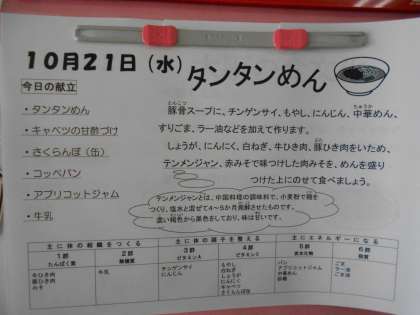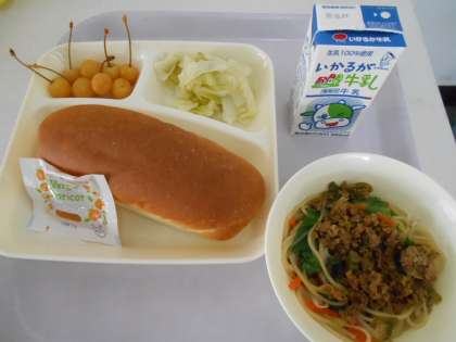 本日の献立は、コッペパン、アプリコットジャム、タンタンメン、キャベツの甘酢づけ、サクランボ、牛乳です。本日の献立の「タンタンメン」は、豚骨スープに、チンゲン菜、もやし、にんじん、中華麺、すりごま、ラー油などを加えてつくられています。テンメンジャンや赤みそで味つけした肉みそをのせて食べます。