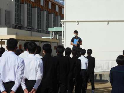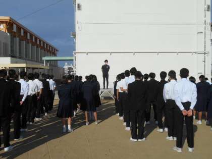 3年生の学年集会を下グラウンドで行いました。岡田先生から、修学旅行を振り返ってみての全員が感じとったであろう「達成感」についてと、そして、来週末に実施される文化祭などの行事に対する取り組みや、3年生として卒業を迎えるまでに、一人ひとりが自分の持てる役割をしっかりと自覚して、「誰一人として欠けてはならない」という思いを持って全員で協力しながら取り組んでいってほしいという、お話がありました。